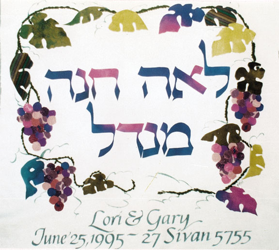 This chuppah center was designed with elements from the ketubah. It was sewn together with squares which were sent to guests and decorated by them, returned to the couple and sewn together to create the chuppah. Peggy created this center section as a collage with pieces of silk and other fine fabrics, and handlettered the names and date with fabric paint. |