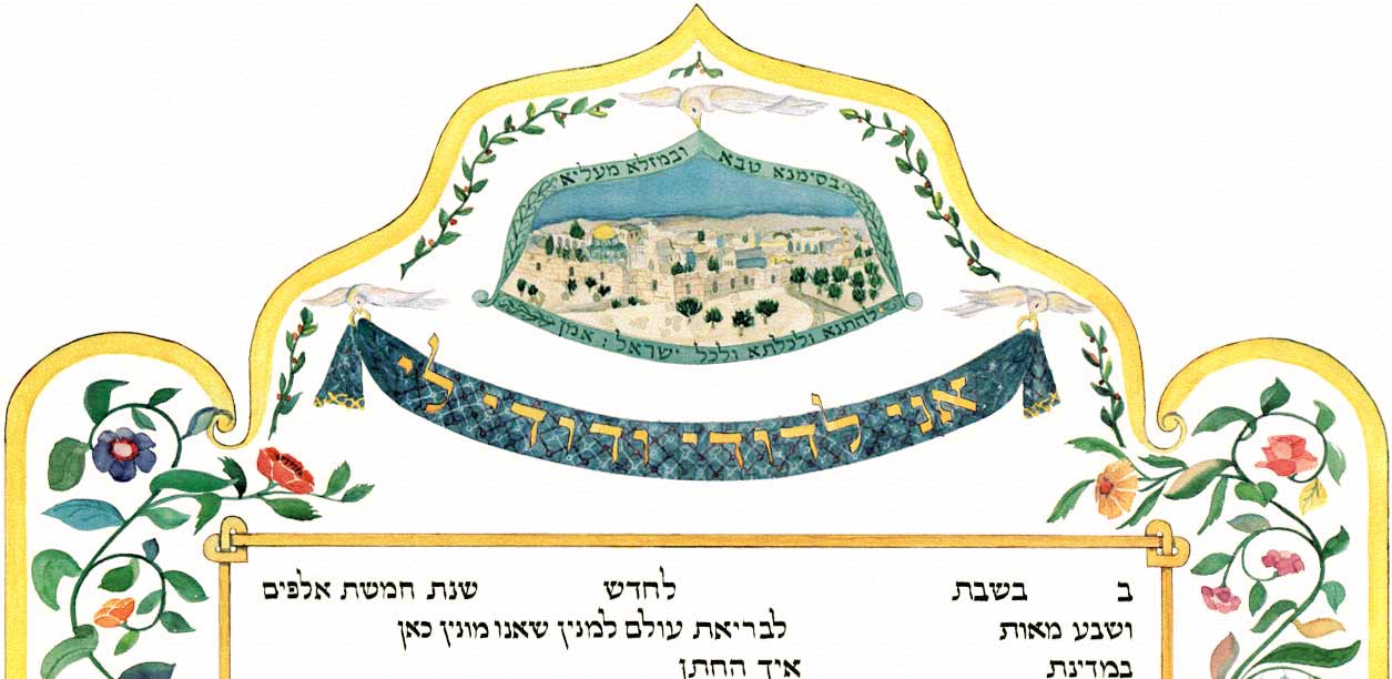 Printed Ketubah: Jerusalem A limited edition print created in 1983. This border is available with either a pre-printed Orthodox text as shown, with the blanks filled in for $135, or any of our standard texts custom-printed within the border for $220 total. Add $100 for a custom text.The ketubah is printed on 100% rag paper and printed in full color. |