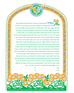 To order: For a Custom-Print Ketubah or Photo Ketubah, use the "How to order" button on this page to fill out the order form and ketubah information form. You will receive an e-mailed proof of the ketubah, to be proofread by you and the rabbi, and when approved, your ketubah will be printed. Call with any questions about what we can do or the cost of any options. See below for further customization options and charges.