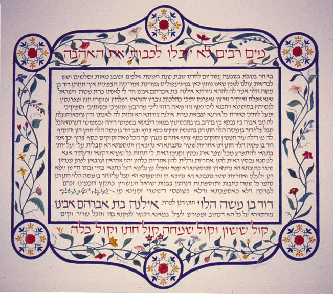 A faded image of a Yemenite ceramic tile inspired this custom ketubah design. Peggy brightened the colors, adapted the border elements and lettered two verses, "Great waters cannot quench love" and "The sounds of joy and gladness, the voices of the groom and bride" for this border. Please note: This illustration is from a photograph of the ketuba taken with uneven lighting and the colors are not faithful reproductions of the original. |