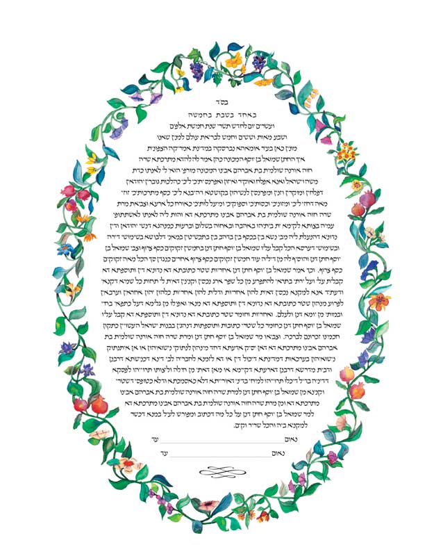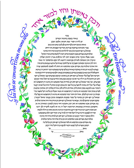 ![]() The Floral Oval Custom-Print Ketubah can accommodate a single-language layout as shown here, or two languages. Usually the Hebrew text is in the upper half of the oval. Scroll further to see this border with a verse surrounding the vine border in three languages. |